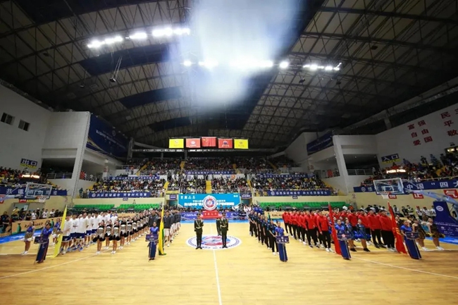 在激昂的樂聲中,裁判員團(tuán)隊(duì)、各參賽隊(duì)及啦啦隊(duì)紛紛入場。場館中央,一面以籃球、握手、麥穗為元素的會徽十分引人注目,寓意“以籃球?yàn)槊?,傳承中國白酒文化,增進(jìn)名白酒情誼”。